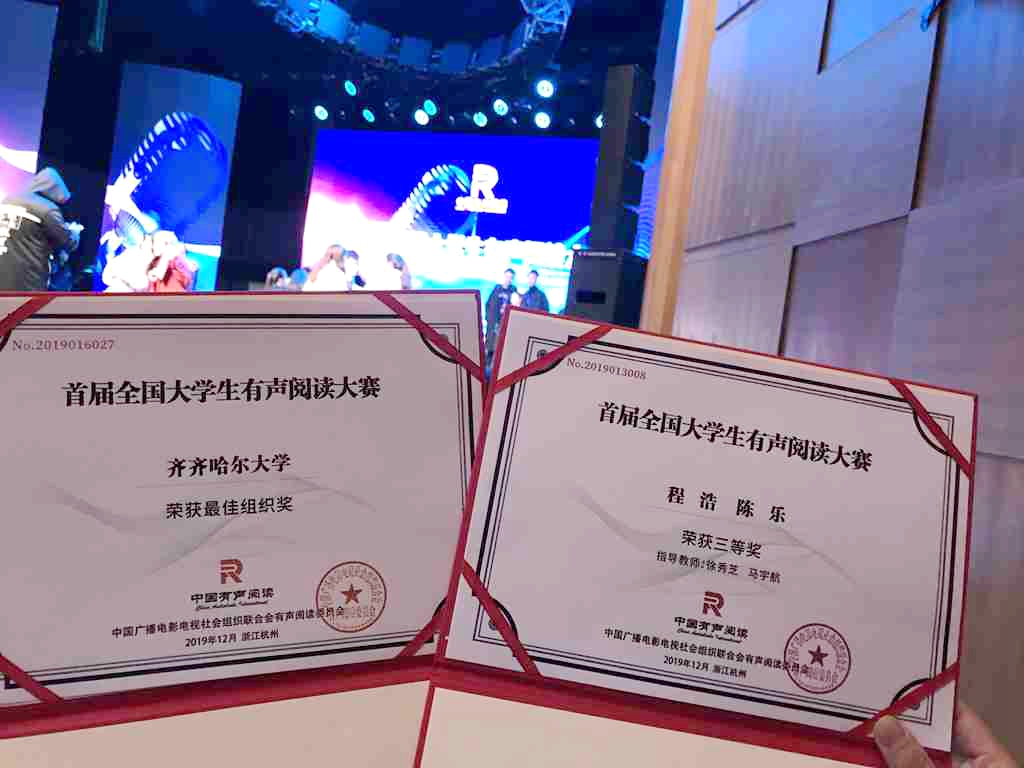 由我校文學(xué)與歷史文化學(xué)院(新聞傳播學(xué)院)播音與主持藝術(shù)專業(yè)17級(jí)陳樂、18級(jí)程浩兩位同學(xué)組成的參賽團(tuán)隊(duì),通過參賽作品《神農(nóng)嘗百草》獲得首屆全國高校有聲閱讀大賽決賽資格并榮獲總決賽三等獎(jiǎng),徐秀芝、馬宇航兩位老師榮獲優(yōu)秀指導(dǎo)教師獎(jiǎng),齊齊哈爾大學(xué)榮獲最佳組織獎(jiǎng)。