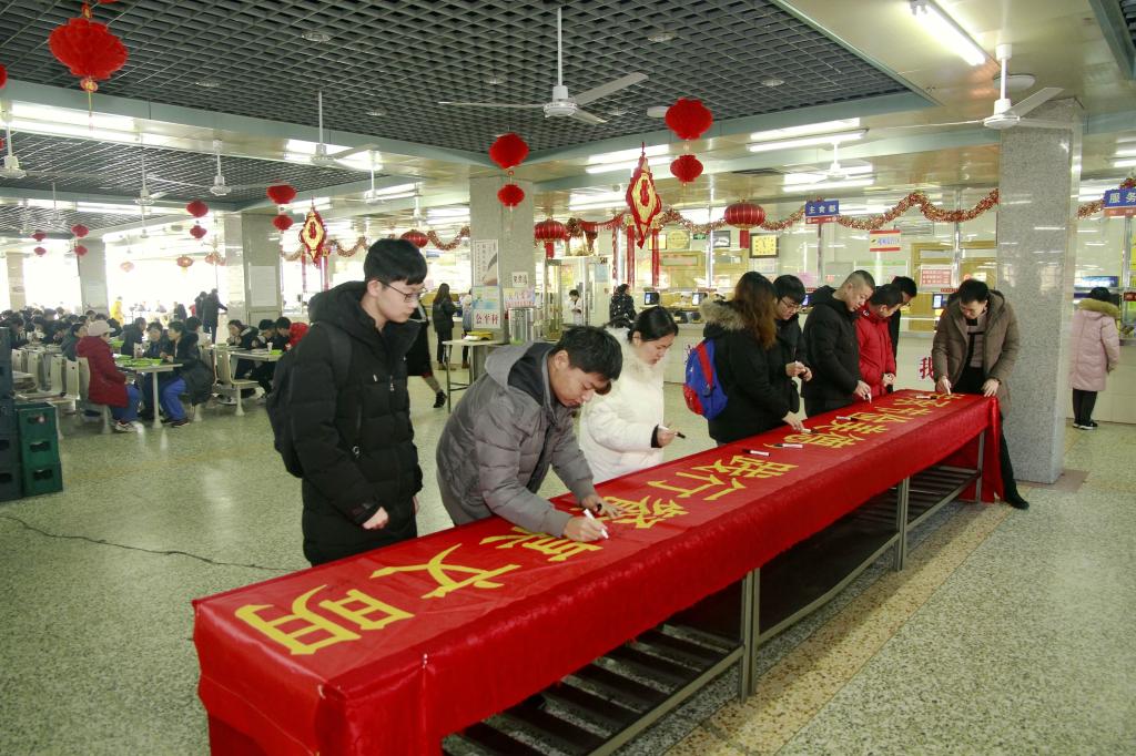 1月2日中午,學(xué)校在各學(xué)生食堂舉辦了“傳承節(jié)儉美德、踐行餐桌文明”師生簽名活動。就餐的師生們在印有“傳承節(jié)儉美德、踐行餐桌文明”的巨大條幅上,鄭重地簽上了自己的名字,承諾要尊重勞動、珍惜幸福、理性消費(fèi)、勤儉節(jié)約。同時,后勤管理處工作人員還向就餐師生發(fā)放了10000份倡議書,使文明用餐理念更加深入人心。