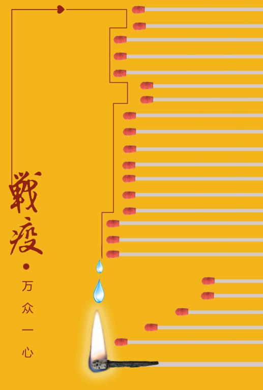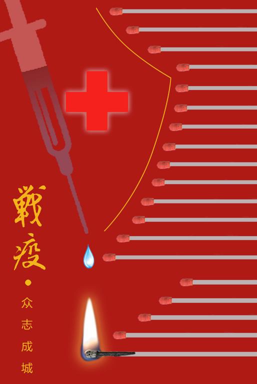 《戰(zhàn)疫》招貼 徐長(zhǎng)春 設(shè)計(jì)說明:用火柴的易燃性代表病毒易傳染,通過火柴組合構(gòu)成注射器和盾牌的部分形體,來表達(dá)治療、隔離和防護(hù)的方法和過程以及隔離的重要性。