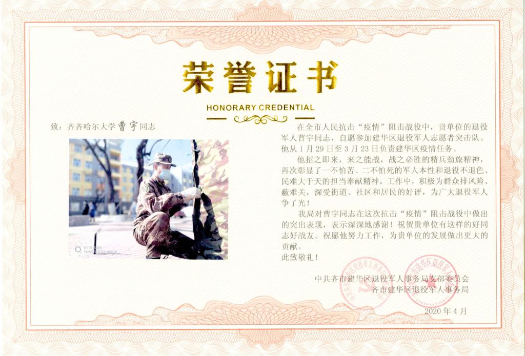 曹宇平日在校時(shí)就樂于助人,無私奉獻(xiàn),在國家和人民有難時(shí)又挺身而出,攻堅(jiān)克難,他的事跡也被更多人知曉。鑒于他在此次疫情防控阻擊戰(zhàn)中的突出表現(xiàn),中共齊齊哈爾市建華區(qū)退役軍人事務(wù)局支部委員會(huì)授予了他優(yōu)秀志愿者徽章與榮譽(yù)證書。他在得知自己獲得這份殊榮時(shí)說道:“雖然證書上寫的是我的名字,但榮譽(yù)背后有著更多無名英雄的汗水與努力。作為一名黨員,一名接受了高等教育的退伍軍人,黨和國家培養(yǎng)了我,在危難之際我就應(yīng)該沖上前去?!?/p>