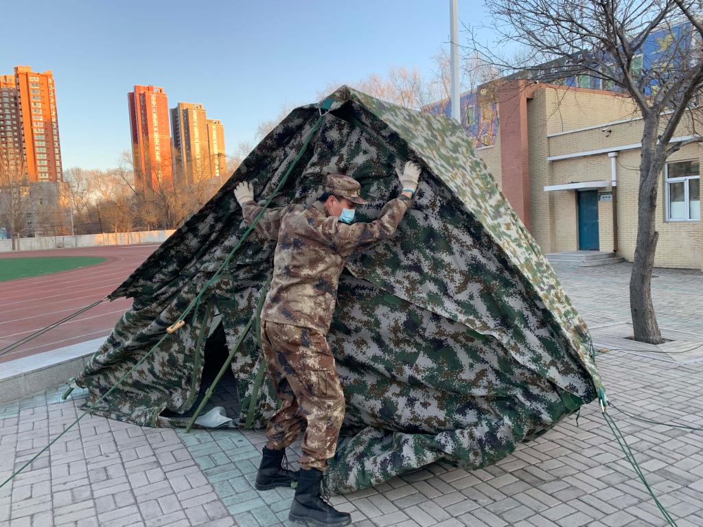 曹宇是齊齊哈爾市建華區(qū)民兵應(yīng)急連的指導(dǎo)員。疫情防控初期,齊齊哈爾市建華區(qū)武裝部就開始支援地方社區(qū)和各路口搭建御寒隔離帳篷。因正處于新年期間,只有曹宇和他的連長兩個(gè)人奔波到各處指導(dǎo)并共同完成帳篷搭建工作。僅僅兩個(gè)星期,就組織搭建了40多頂帳篷。疫情愈發(fā)嚴(yán)重,曹宇還沒來得及歇一歇,就加入了退役軍人事務(wù)局的老兵們自發(fā)組織的退伍老兵突擊隊(duì),帶領(lǐng)大家沖到疫情防控的前線。