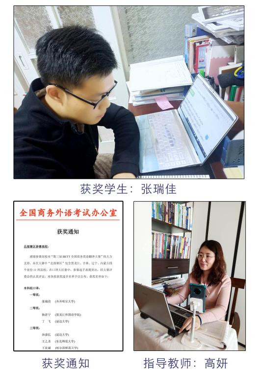 據(jù)指導(dǎo)老師高妍副教授介紹,早在2020年1月,外國語學(xué)院就派出了7名同學(xué)參加了該賽事黑龍江賽區(qū)的筆譯和口譯復(fù)賽,并全部獲獎。這次口譯大區(qū)賽共有來自黑龍江省、吉林省、遼寧省和內(nèi)蒙古自治區(qū)的11所高校參賽。我校學(xué)生張瑞佳與東北師范大學(xué)、哈爾濱師范大學(xué)等高校的學(xué)生同臺競技,斬獲了唯一的一等獎。這次獲獎代表著我校英語專業(yè)應(yīng)用型建設(shè)取得了可喜的成果,更體現(xiàn)出我校學(xué)生在疫情防控期間積極向上的精神風(fēng)貌。