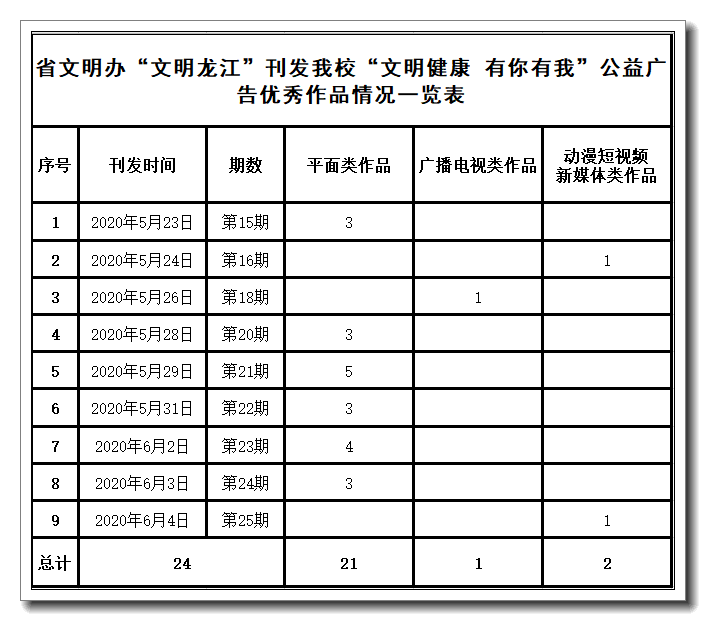截至近日統(tǒng)計,我校有24項作品入選省文明辦“文明健康 有你有我”公益廣告優(yōu)秀作品征集活動,涵蓋平面類作品21件、廣播電視類作品1件、動漫短視頻新媒體類作品2件,被黑龍江文明網(wǎng)、“文明龍江”微信公眾號推介9期,向社會廣泛宣傳推廣,產(chǎn)生了積極而廣泛的社會反響,進一步提升了我校的知名度和美譽度,發(fā)揮了全國文明單位的示范、輻射和引領(lǐng)作用。