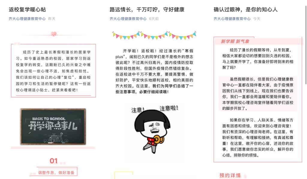 從冬到夏,從夏到秋,從線下到線上,學(xué)校心理健康教育中心一直用愛與溫暖陪伴著同學(xué)們成長。新學(xué)期伊始,學(xué)校心理健康教育中心連續(xù)推出《返校復(fù)學(xué)暖心帖》、《確認(rèn)過眼神,是你的知心人》,而且每一條信息最后都有一個(gè)關(guān)于天氣情況的“溫馨提示”,提醒同學(xué)們注意天氣變化,適當(dāng)增加衣物。