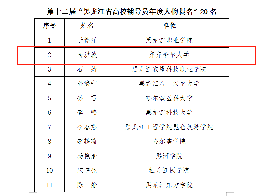 近日,2020年“黑龍江省最美高校輔導員”暨第十二屆“黑龍江省高校輔導員年度人物”評審會落下帷幕,經(jīng)組織推薦、資格審核、專家遴選、網(wǎng)絡(luò)答辯等程序,全省共評選2020年“黑龍江省最美高校輔導員”10人,第十二屆“黑龍江省高校輔導員年度人物”10人,年度人物提名獎20人。我校國際教育學院輔導員馬洪波獲得“2020年黑龍江省高校輔導員年度人物提名獎”榮譽稱號。