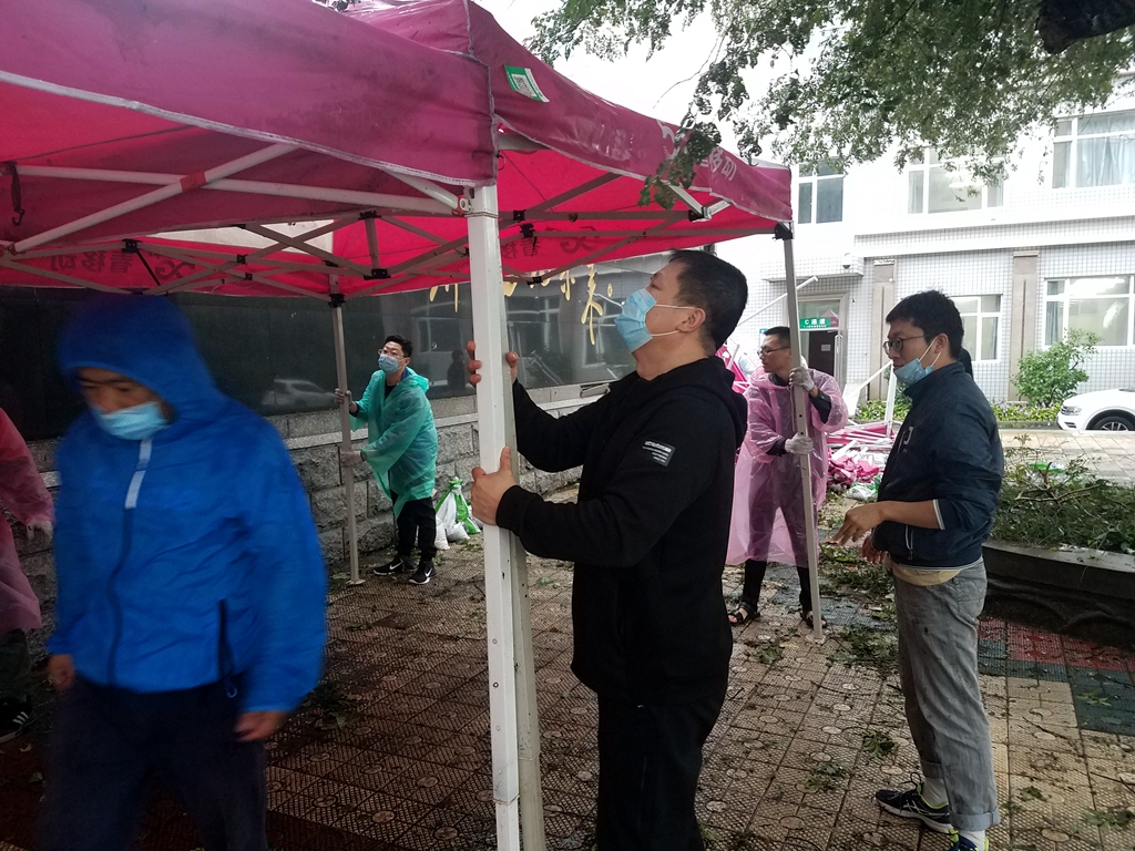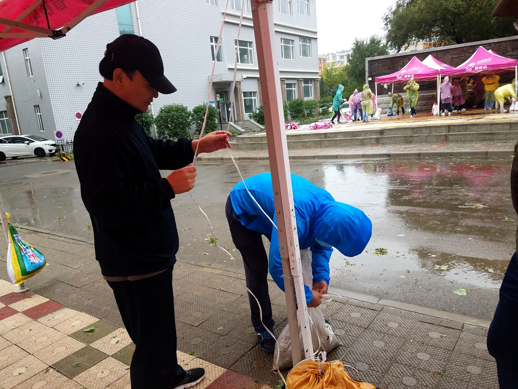 9月3日以來,受臺風(fēng)“美莎克”影響,齊齊哈爾全市出現(xiàn)強降雨、大風(fēng)天氣,我校校園中部分地段也出現(xiàn)積水等情況,4日下午,學(xué)生工作部(學(xué)生處)工作人員及各學(xué)院學(xué)生工作干部趟過積水來到中區(qū)和東區(qū)學(xué)生返校報到接待處,頂風(fēng)冒雨搭建遮雨棚等接待工作設(shè)施,為第二天同學(xué)們返校報到做好充足的準備工作。