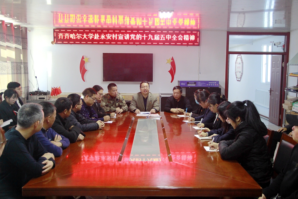 11月28日,為進(jìn)一步深化新時(shí)代文明實(shí)踐中心建設(shè),拓展理論宣講志愿服務(wù)平臺,助推鄉(xiāng)風(fēng)文明建設(shè)和鄉(xiāng)村振興戰(zhàn)略,校黨委宣傳部副部長何強(qiáng)教授深入拜泉縣上升鄉(xiāng)永安村,宣講黨的十九屆五中全會精神和省委十八屆二次全會精神。齊齊哈爾大學(xué)駐永安村第一書記秦浩波,永安村黨支部書記陳存山等村“兩委”成員,齊齊哈爾大學(xué)哲學(xué)與法學(xué)學(xué)院黨委書記于春梅等師生黨員參加了宣講活動(dòng)。