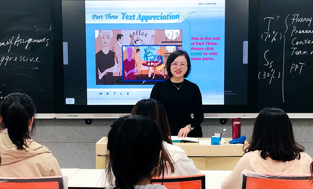 新冠肺炎疫情爆發(fā)后,全校上下積極響應(yīng)國家號召“停課不停學(xué)”,在線教學(xué)工作扎實開展。王楠同教學(xué)團隊一道,在短短十天的時間里完成兩門在線課程的建設(shè),保障了疫情期間在線教學(xué)的順利開展。在線教學(xué)期間,她投入了大量的時間和精力,每周平均批閱文本類作業(yè)120份,語音作業(yè)300多分鐘,課堂互動程度與線下傳統(tǒng)課堂最大程度持平,利用信息技術(shù)為學(xué)生們提供更多的課堂互動、鼓勵更多的同學(xué)參與教學(xué)活動,最大化發(fā)揮了師生共同評價機制,讓學(xué)生們參與到教學(xué)中,以評促學(xué),在評價中學(xué)習(xí),以評價標(biāo)準(zhǔn)為參考提升其英語專業(yè)素養(yǎng)。在學(xué)期末,王楠充分利用新媒體技術(shù)優(yōu)勢,及時有效地為學(xué)生課前自主學(xué)習(xí)提供充足的預(yù)習(xí)資源,為他們提供課后作業(yè)的反饋。一個學(xué)期下來,她所教授的幾個班級學(xué)生的口語表達技能均有明顯地提升,同時學(xué)生們在語篇理解、文本分析等方面都有了長足進步。這一教學(xué)模式和教學(xué)經(jīng)驗,疫情期間在全國范圍內(nèi)得到了廣泛推廣。
