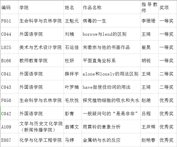 為加快我校師范類學(xué)生教學(xué)綜合能力培養(yǎng),推進(jìn)高素質(zhì)教師隊(duì)伍建設(shè)和精品課程建設(shè),普及信息化教學(xué)手段,促進(jìn)信息技術(shù)與教育的深度融合,探索微課在課堂教與學(xué)創(chuàng)新應(yīng)用中的有效模式,促進(jìn)優(yōu)質(zhì)教育資源共建共享,按照“全國(guó)第二屆師范生微課大賽”組委會(huì)要求,我校經(jīng)過(guò)嚴(yán)格評(píng)審,遴選優(yōu)秀微課作品參加了全國(guó)第二屆師范生微課大賽決賽,近日決賽成績(jī)公布,我校共有十名選手脫穎而出,其中四名學(xué)生榮獲大賽一等獎(jiǎng),兩名學(xué)生榮獲大賽二等獎(jiǎng),四名學(xué)生榮獲大賽優(yōu)秀獎(jiǎng)。具體獲獎(jiǎng)信息如下: