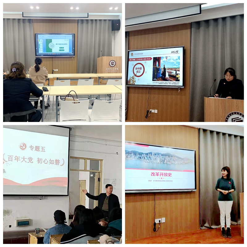 2020年以來,馬克思主義學(xué)院結(jié)合“三會(huì)一課”,開展了系列“四史”集中學(xué)習(xí)。以支委會(huì)設(shè)定議題討論學(xué),黨員大會(huì)集中學(xué),黨小組研討學(xué),先后就黨的成立、兩個(gè)歷史決議、新中國史、改革開放史進(jìn)行專題培訓(xùn)學(xué)習(xí)。通過講黨史故事追憶崢嶸歲月,敘新中國史歌頌偉大成就,談改革開放史禮贊非凡業(yè)績(jī),研社會(huì)主義發(fā)展史理清時(shí)空脈絡(luò)。以教師先學(xué)先會(huì)先行引導(dǎo)學(xué)生學(xué)會(huì)學(xué)懂學(xué)深。本學(xué)期,還在形勢(shì)與政策課中設(shè)置了“百年大黨 初心如磐”的專題,使黨史學(xué)習(xí)教育在課程上做到專題化、理論化、系統(tǒng)化、長期化。