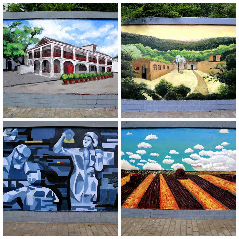 彩繪墻以“紅、藍(lán)、黃、綠”四種顏色把墻面分成四個(gè)主題集中表現(xiàn)黨領(lǐng)導(dǎo)人民百年來波瀾壯闊的奮斗史。紅色表現(xiàn)了中國共產(chǎn)黨篳路藍(lán)縷奠基立業(yè)的發(fā)展歷程、藍(lán)色表現(xiàn)了新中國攻堅(jiān)克難如火如荼的工業(yè)建設(shè)進(jìn)程、黃色表現(xiàn)了改革開放糧食豐收鄉(xiāng)村振興事業(yè)的穩(wěn)步推進(jìn)歷程、綠色表現(xiàn)了低碳環(huán)保的生態(tài)文明建設(shè)日新月異的奮斗進(jìn)程。