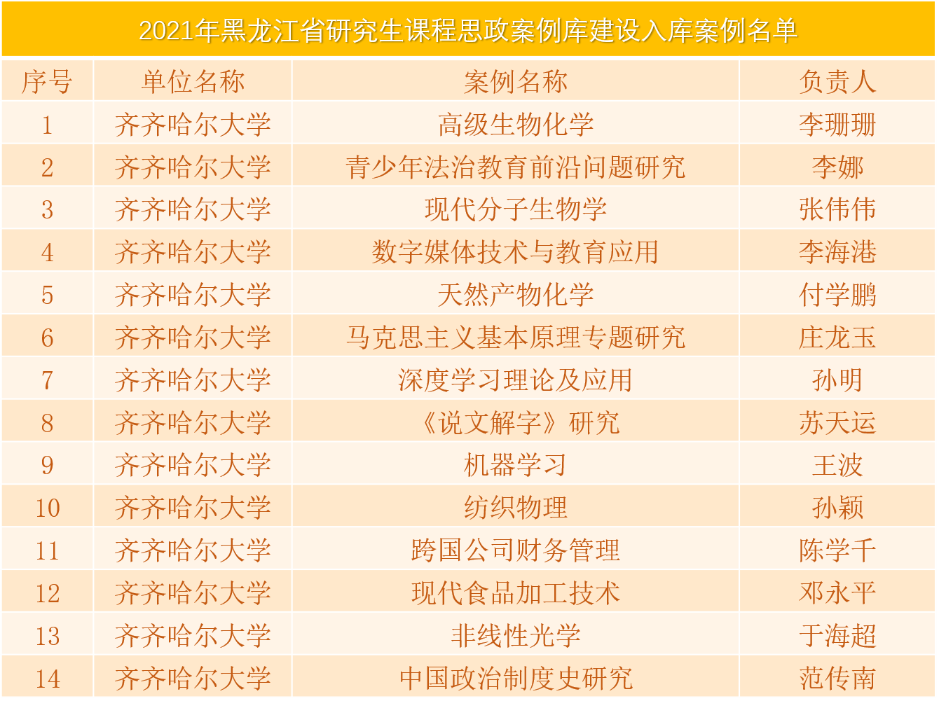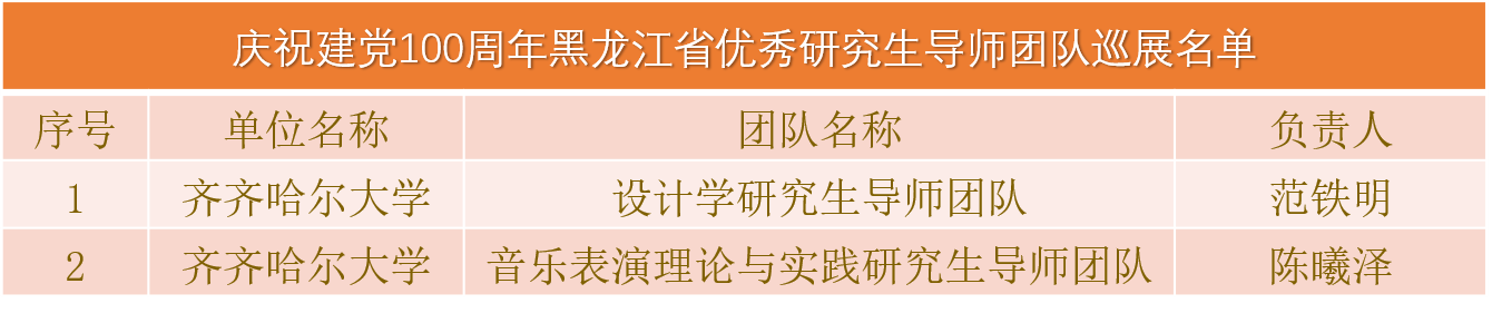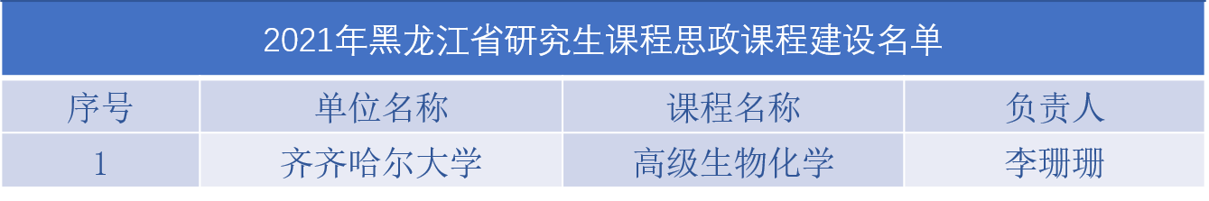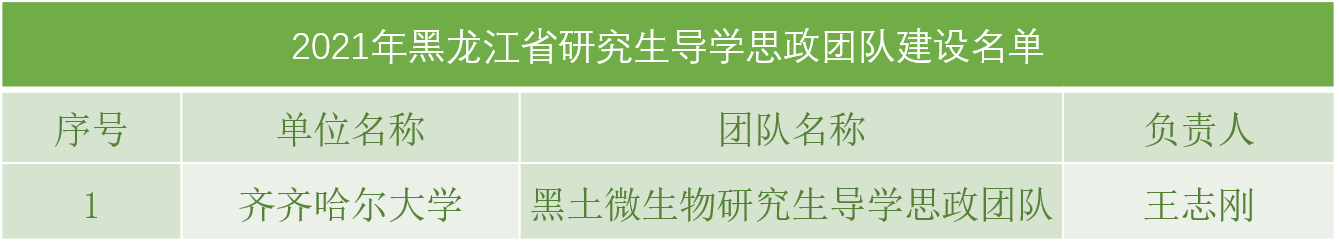 根據(jù)《省學位委員會省教育廳關于公布2021年黑龍江省研究生課程思政、導學思政高質(zhì)量建設項目立項結(jié)果的通知》(黑學位聯(lián)〔2021〕2號),我校共有16個項目獲批省級立項,其中研究生課程思政課程1門、研究生導學思政團隊(導師)1個、研究生課程思政入庫案例14個。同時公布的還有我校參加慶祝建黨100周年巡展2支優(yōu)秀研究生導師團隊名單。