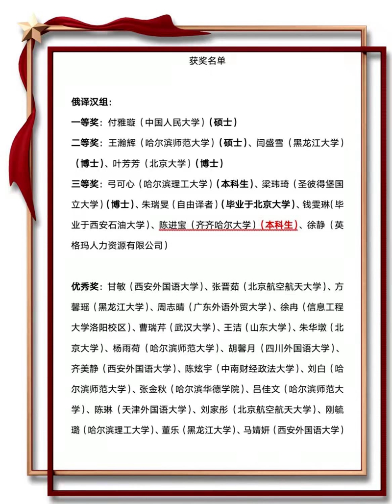 11月1日,由黑龍江大學(xué)俄語學(xué)院與黑龍江省俄語學(xué)會(huì)聯(lián)合主辦的首屆俄漢互譯大賽評(píng)選結(jié)果揭曉,我校外國語學(xué)院俄語專業(yè)181班陳進(jìn)寶同學(xué)榮獲本屆賽事俄譯漢組別三等獎(jiǎng),為學(xué)校爭(zhēng)得了榮譽(yù)。