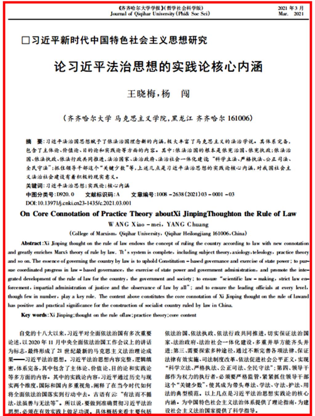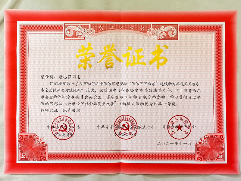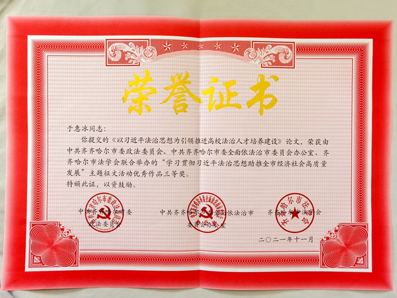 學(xué)思踐悟,細照篤行。學(xué)校黨委高度重視學(xué)習(xí)宣傳貫徹習(xí)近平法治思想。習(xí)近平法治思想是馬克思主義法治理論同中國實際相結(jié)合的最新成果,是21世紀馬克思主義法治思想,是習(xí)近平新時代中國特色社會主義思想的重要組成部分,是全面依法治國的根本遵循和行動指南,深刻回答了為什么要全面依法治國、怎樣全面依法治國這個重大時代課題。校、院兩級黨委將習(xí)近平法治思想的學(xué)習(xí)納入黨委理論學(xué)習(xí)中心組學(xué)習(xí)計劃、納入教職工政治理論學(xué)習(xí)計劃,組織廣大師生員工充分利用“學(xué)習(xí)強國”“黑龍江教育干部網(wǎng)絡(luò)學(xué)院”等網(wǎng)絡(luò)平臺等多種形式,學(xué)深悟透習(xí)近平法治思想,深刻領(lǐng)會其重大意義、精神實質(zhì)、實踐要求,學(xué)懂弄通《法治中國建設(shè)規(guī)劃(2020—2025年)》把習(xí)近平法治思想融入教學(xué)體系。自2021年9月開始,將“習(xí)近平法治思想概論”納入了2021級法學(xué)專業(yè)基礎(chǔ)必修課,做好進教材、進課堂、進頭腦工作。加強習(xí)近平法治思想的理論研究和闡釋,發(fā)表《論習(xí)近平法治思想的實踐論核心內(nèi)涵》等論文;在齊齊哈爾市“學(xué)習(xí)貫徹習(xí)近平法治思想”主題征文活動中,我校師生榮獲一等獎、三等獎各1篇。推動習(xí)近平法治思想入腦入心、走深走實,不斷增強法治意識,提高法治能力水平。