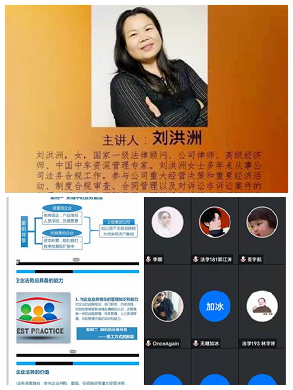 10月20日,法學(xué)專業(yè)舉辦的“運用法治思維彰顯法務(wù)價值——企業(yè)經(jīng)營活動中法務(wù)實踐”線上專題講座。劉洪洲女士理論聯(lián)系實際,為法學(xué)專業(yè)師生展現(xiàn)了作為一個大企業(yè)的法律顧問需要具有整體思維和多維度解決問題的能力。
