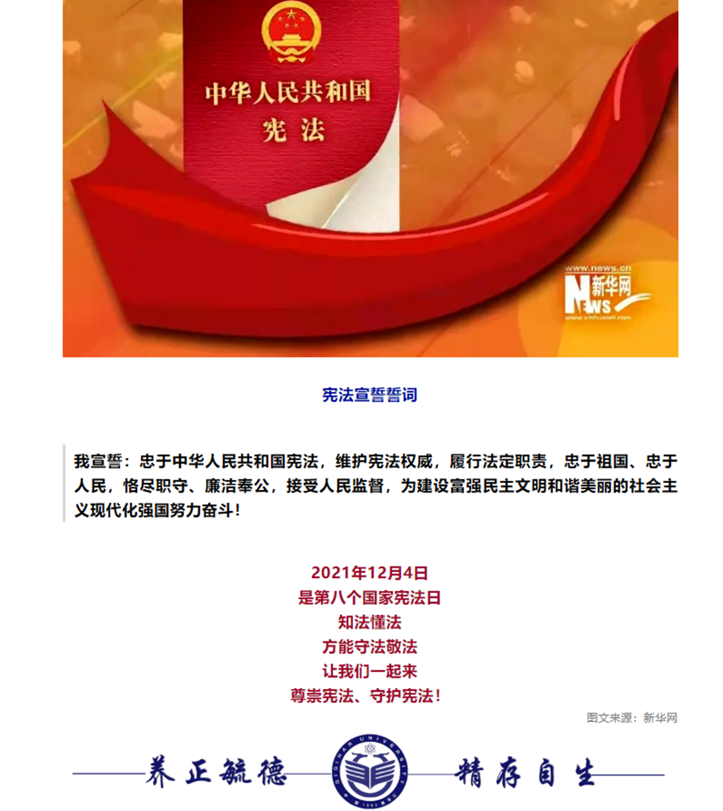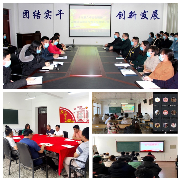 治國憑圭臬,安邦靠準繩。法律權(quán)威源自人民的內(nèi)心擁護和真誠信仰,加強憲法學(xué)習(xí)宣傳教育是實施憲法的重要基礎(chǔ)。我校各基層黨委、直屬黨支部迅速行動、積極部署,圍繞習(xí)近平法治思想,特別是總書記關(guān)于憲法的重要論述;黨的十九屆六中全會精神;中華人民共和國憲法;社會主義核心價值觀;中華人民共和國民法典;疫情防控相關(guān)法律法規(guī)開展了教師、學(xué)生各層面的學(xué)習(xí)活動,掀起學(xué)習(xí)熱潮。