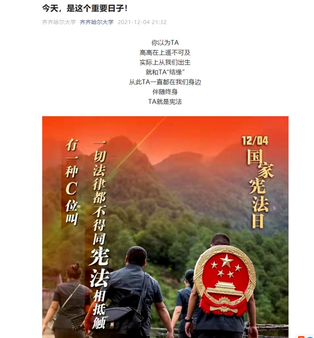 在第八個國家憲法日,教育部舉辦了教育系統(tǒng)的“憲法晨讀”活動,各單位各部門積極組織學(xué)生參與,一起誦讀憲法部分條款,觀看“學(xué)憲法 講憲法活動全國總決賽頒布獲獎名單及部分優(yōu)秀學(xué)生的現(xiàn)場展演。共同學(xué)習(xí)憲法知識,體會憲法溫度,感受憲法力量。