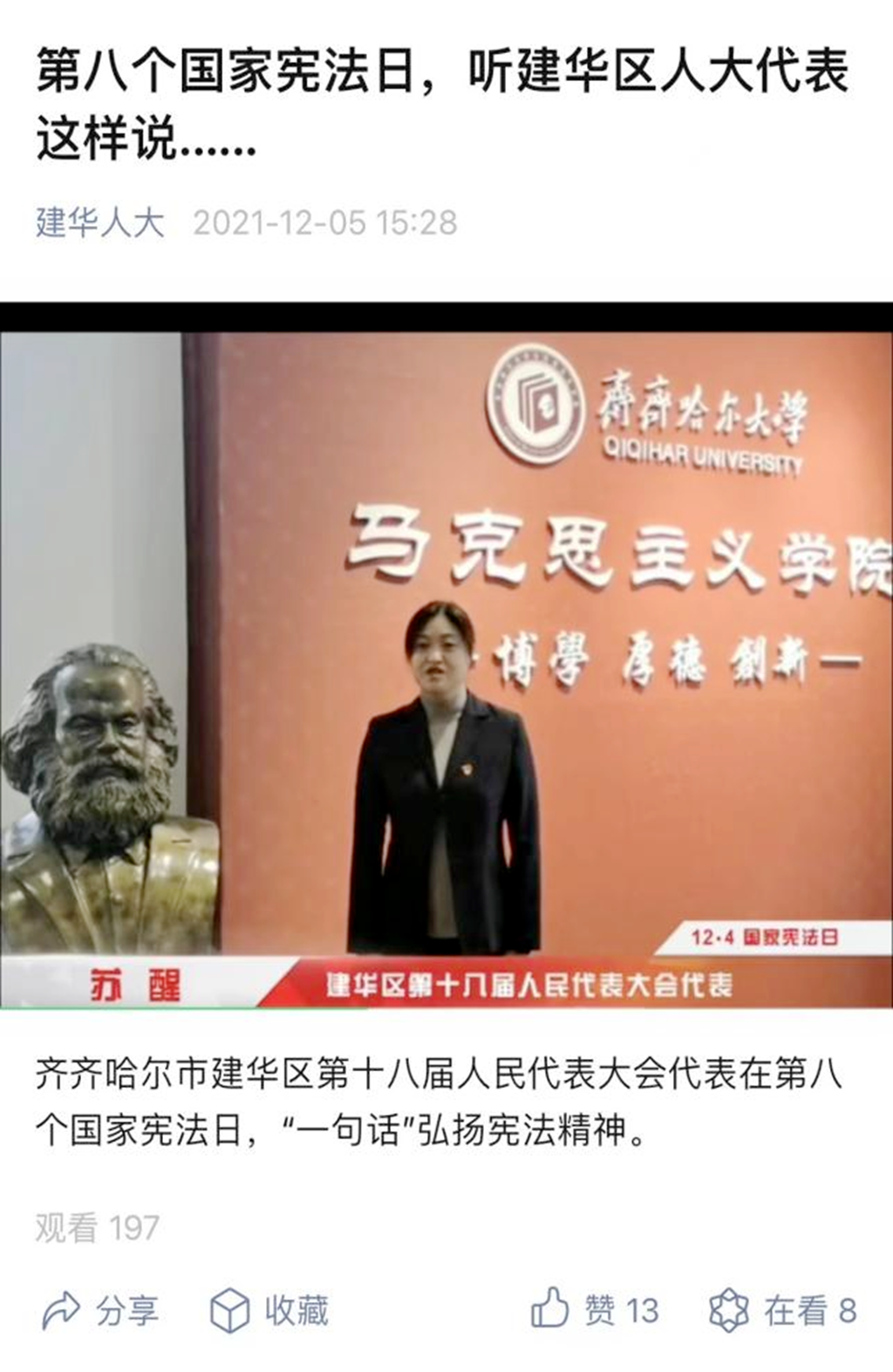 馬克思主義學(xué)院黨委書記蘇醒作為建華區(qū)人大代表,帶頭學(xué)習(xí)習(xí)近平法治思想,積極進行“國家憲法日”宣傳。