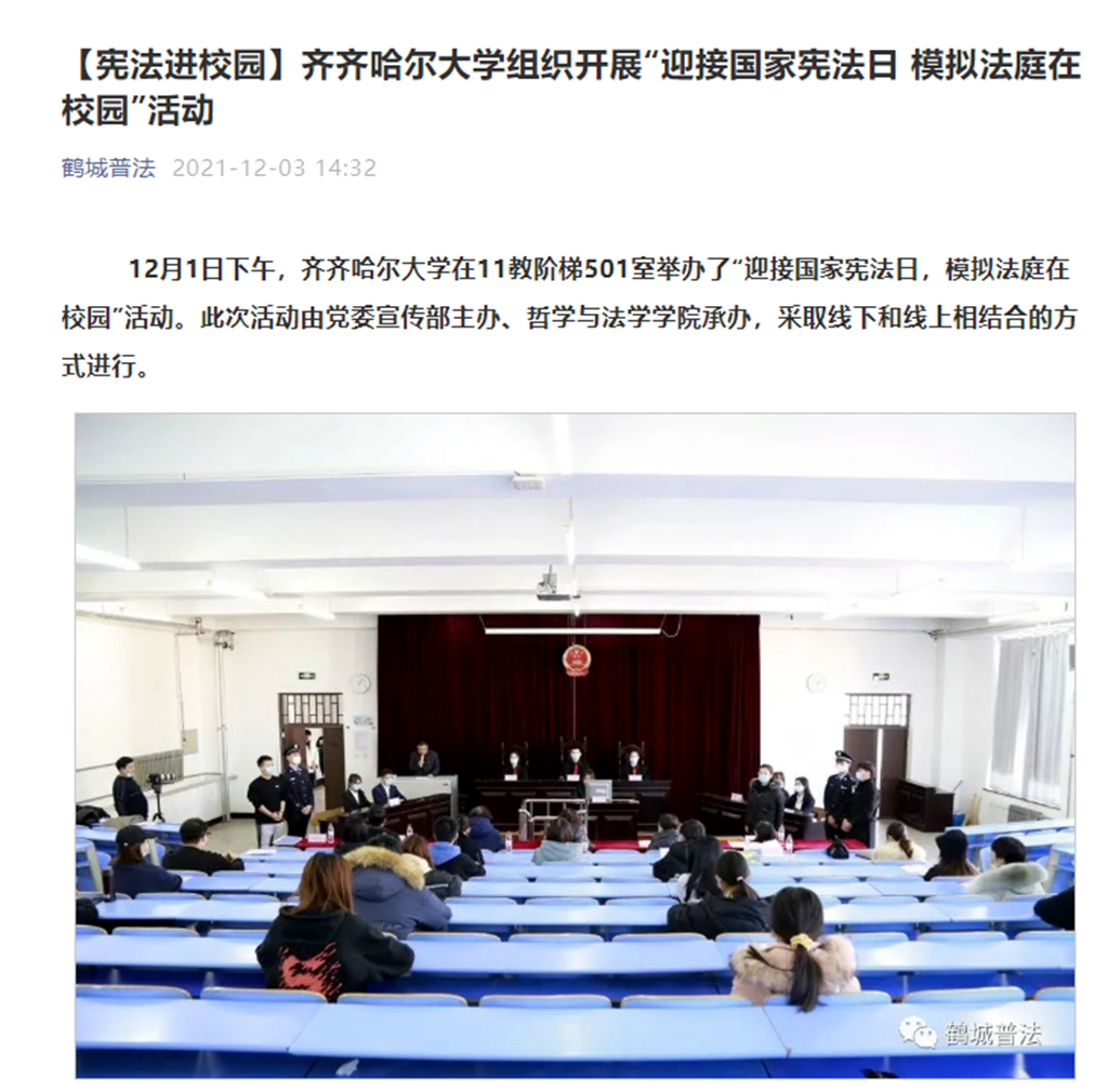 久久為功,馳而不息。堅持不懈開展“模擬法庭”實踐活動是我校特色鮮明的常態(tài)化法治宣傳教育活動。哲學(xué)與法學(xué)學(xué)院利用法學(xué)學(xué)科專業(yè)優(yōu)勢,結(jié)合教學(xué)內(nèi)容,不斷總結(jié)經(jīng)驗,持續(xù)打造“模擬法庭”精品活動,在學(xué)校法治宣傳教育活動中發(fā)揮了典型示范的作用。12月1日,校黨委副書記齊宏偉,校黨委常委、宣傳部長王曉梅,哲學(xué)與法學(xué)學(xué)院黨委書記于春梅,宣傳部副部長何強,哲學(xué)與法學(xué)學(xué)院副院長苗繪等與師生代表一起參加了以真實案例改編的“幫助信息網(wǎng)絡(luò)犯罪案”的模擬法庭庭審活動。以線下和線上相結(jié)合的方式,以案說法全程直播,在嚴密的法律程序和莊重嚴肅的法庭氣氛中,讓師生身臨其境感受法治權(quán)威。融專業(yè)性、知識性、教育性、警示性為一體,提高學(xué)生法治意識,增強法治觀念引導(dǎo)學(xué)生知法明理。12月3日,齊齊哈爾市司法局“鶴城普法”微信公眾號作了報道。