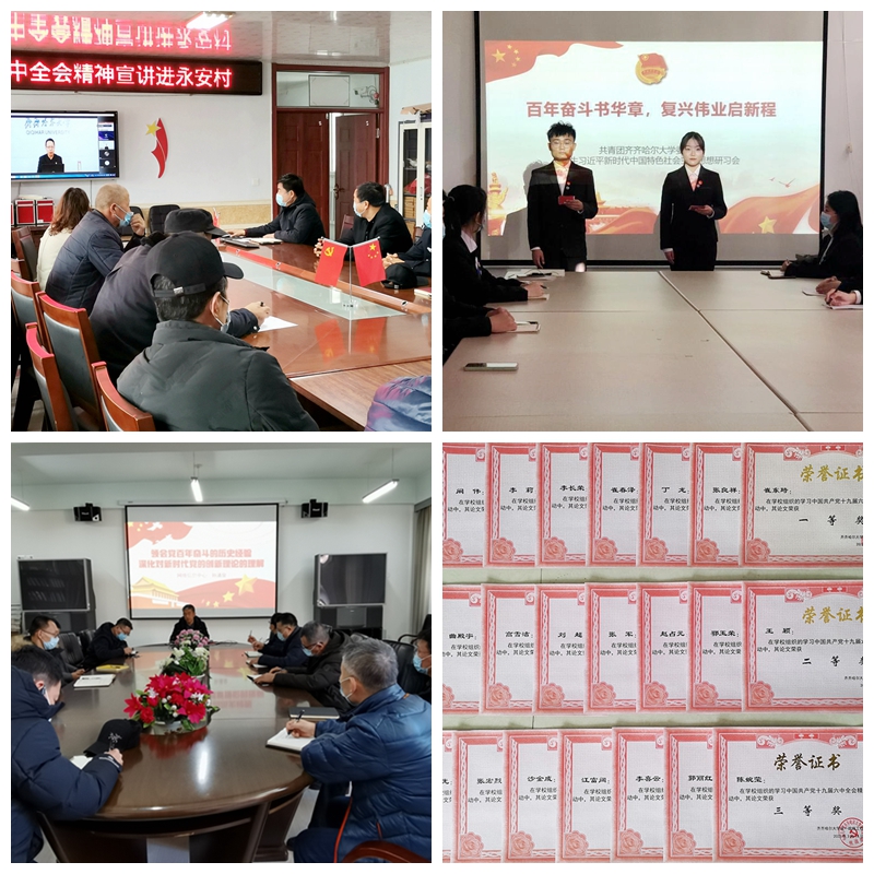 為深入推進(jìn)學(xué)習(xí)黨的十九屆六中全會精神走深走實,實現(xiàn)全會精神解讀全覆蓋,學(xué)校各二級單位黨委、直屬黨支部在全會召開后第一時間組織全體黨員以中心組專題學(xué)習(xí)、理論學(xué)習(xí)讀書班、專題黨課等形式對黨的十九屆六中全會精神進(jìn)行了學(xué)習(xí);學(xué)校各民主黨派、團體也積極開展了座談研討活動,民主黨派團體成員紛紛撰文談感受,表示要以黨的十九屆六中全會精神為指引,做好本職工作,畫好最大同心圓。經(jīng)過評審,投稿文章共評選出一等獎8篇,二等獎8篇,三等獎7篇;校團委組織“青年學(xué)生黨的創(chuàng)新理論宣講團”開展了黨的十九屆六中全會精神專題宣講,“學(xué)生自己講”的宣講方式激起了同學(xué)們學(xué)習(xí)黨的創(chuàng)新理論的熱情,宣講結(jié)束后,我校青年學(xué)生代表們紛紛表示,要在深入學(xué)習(xí)新時代黨的創(chuàng)新理論最新成果中,不斷增強聽黨話、跟黨走的思想自覺和行動自覺,以昂揚向上的精神風(fēng)貌迎接黨的二十大勝利召開。為深化新時代文明實踐中心共建共創(chuàng),校黨委宣傳部副部長何強教授受邀為拜泉縣上升鄉(xiāng)永安村黨員群眾做了黨的十九屆六中全會精神線上專題輔導(dǎo)宣講,宣講報告主題鮮明、內(nèi)容豐富、數(shù)據(jù)詳實,拜泉縣委宣傳部以《駐永安村工作隊 讓創(chuàng)新理論走入基層百姓家》為題對此進(jìn)行了專題報道。