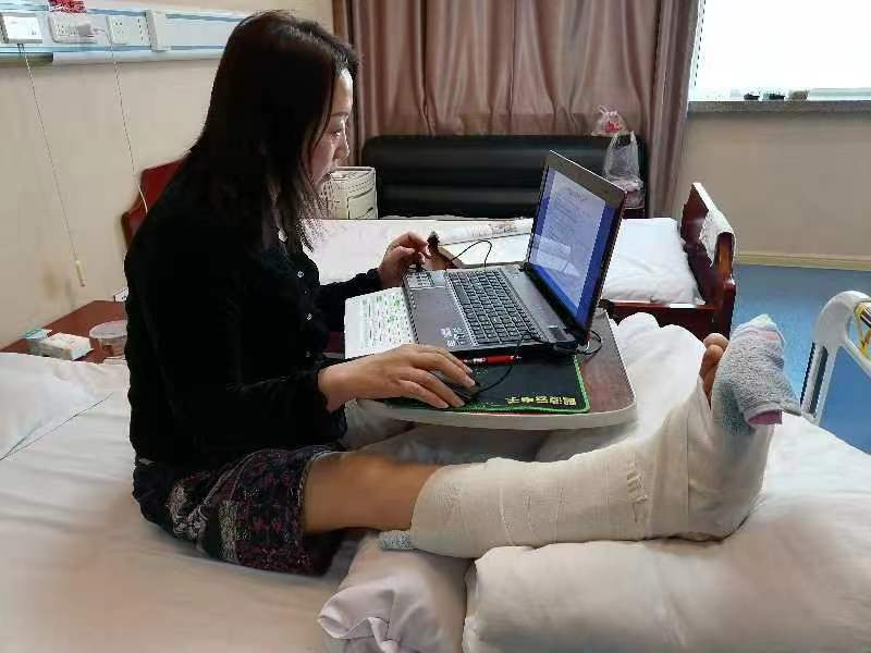 今年三月中旬,王莉娟老師被醫(yī)院確診為右腿腳踝骨粉碎性骨折,必須住院手術(shù)治療。家人擔(dān)心影響她身體康復(fù),反復(fù)勸說(shuō)她同意同事幫她代課,可她卻毅然決然選擇了在病床上堅(jiān)持為同學(xué)們線上授課。由于在腳部植入了鋼釘、鋼板,外面還要戴著厚重的石膏夾板,上課時(shí)她的腿需要一直抬高,酸麻難忍,在身體極度不適的情況下,王莉娟老師認(rèn)真上好了每一堂課,沒(méi)有絲毫松懈,一次都沒(méi)有耽誤教學(xué)。同學(xué)們每每看到她大汗淋漓的樣子,都像家人一樣倍感心痛,紛紛在公屏上為她點(diǎn)贊致謝??伤齾s笑著說(shuō),這沒(méi)什么,不是有一句話叫“共產(chǎn)黨員輕傷不下火線”嘛!