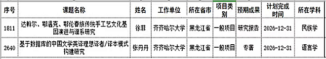 日前,全國哲學社會科學工作辦公室發(fā)布2022年國家社會科學基金年度項目和青年項目評審結(jié)果,我校美術(shù)與藝術(shù)設(shè)計學院徐菲老師申報的《達斡爾、鄂溫克、鄂倫春族傳統(tǒng)手工藝文化基因演進與譜系研究》和外國語學院張丹丹老師申報的《基于數(shù)據(jù)庫的中國文學英譯理想譯者/譯本模式構(gòu)建研究》獲批國家社科基金一般項目,這是張丹丹老師第二次獲批國家社科基金項目。目前,外國語學院已獲批3項國家社科基金項目,美術(shù)與藝術(shù)設(shè)計學院已獲批2項國家社科基金項目。