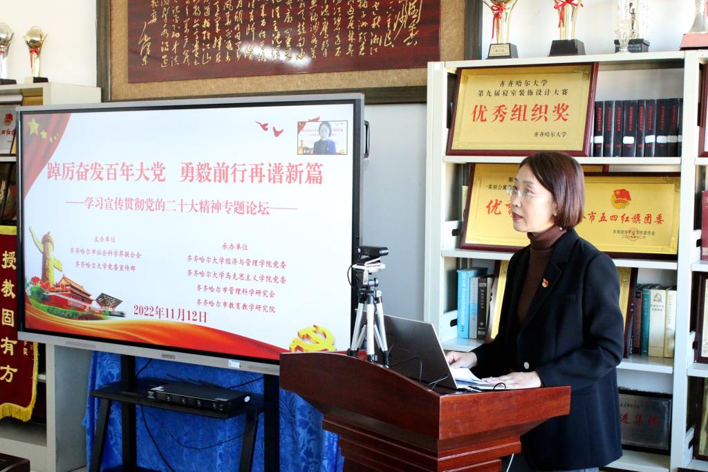 為深入學習宣傳貫徹黨的二十大精神,進一步加深全體師生對黨的二十大精神的理解和把握,11月12日下午,由學校黨委宣傳部、齊齊哈爾市社會科學界聯(lián)合會共同主辦,經(jīng)濟與管理學院黨委與馬克思主義學院黨委、齊齊哈爾市管理科學研究會、齊齊哈爾市教育教學研究院共同承辦的學習宣傳貫徹黨的二十大精神專題論壇在逸夫樓1304會議室成功舉行。