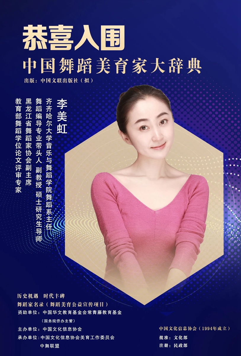近日,中國文化信息協(xié)會、中舞聯(lián)盟發(fā)布了《中國舞蹈美育家大辭典》編撰信息,我校音樂與舞蹈學(xué)院李美虹老師正式入編該辭典。