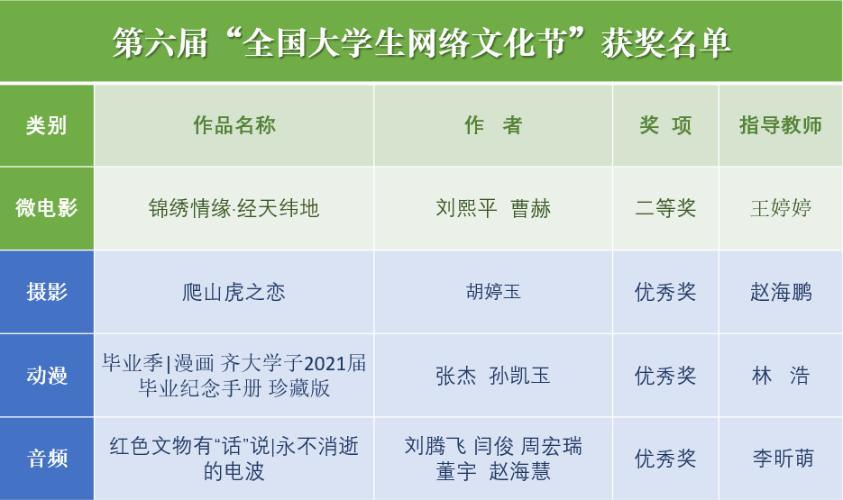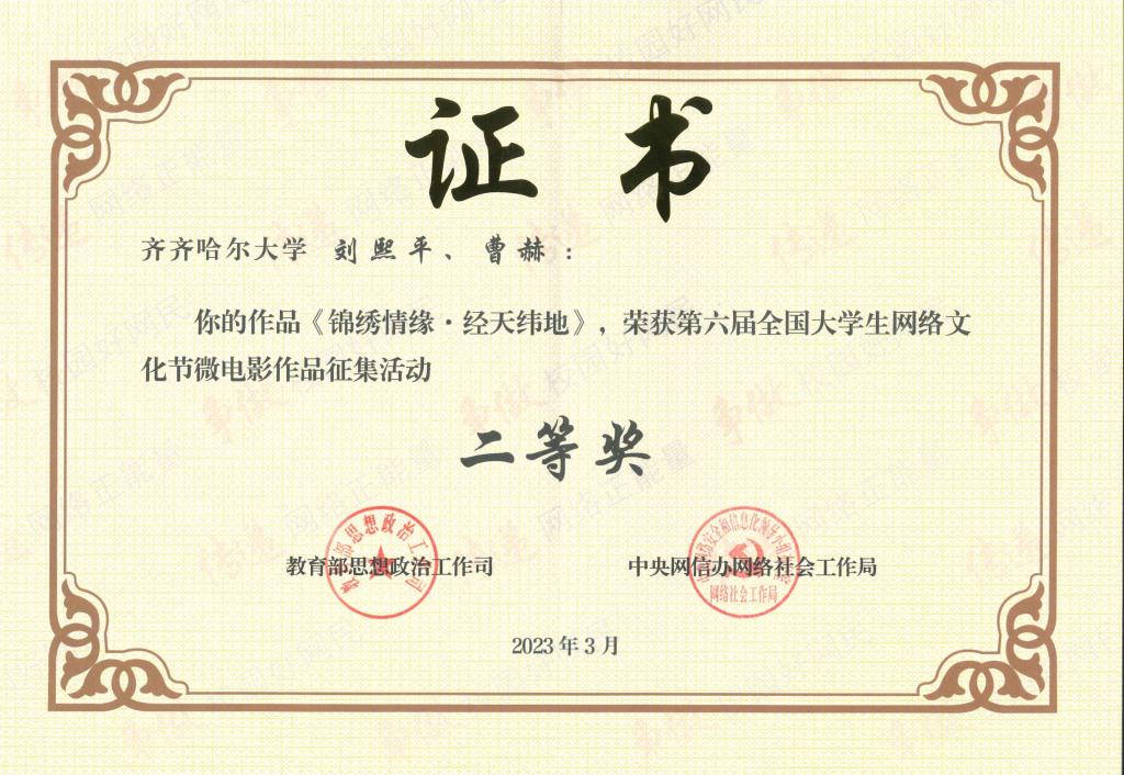 近日,由教育部思想政治工作司、中央網信辦網絡社會工作局主辦的第六屆“全國大學生網絡文化節(jié)”公布了遴選結果。我校斬獲全國二等獎1項,全國優(yōu)秀獎3項。其中,文學與歷史文化學院(新聞傳播學院)王婷婷老師指導,劉熙平、曹赫同學創(chuàng)作的《錦繡情緣·經天緯地》榮獲微電影類作品二等獎;齊齊哈爾大學廣播電臺胡婷玉同學的作品《爬山虎之戀》榮獲攝影類作品優(yōu)秀獎;易班工作室張杰、孫凱玉創(chuàng)作的《畢業(yè)季|漫畫 齊大學子2021屆畢業(yè)紀念手冊 珍藏版》榮獲動漫類作品優(yōu)秀獎;齊齊哈爾大學廣播電臺劉騰飛、閆俊、周宏瑞、董宇、趙?;弁瑢W的作品《紅色文物有“話”說|永不消逝的電波》榮獲音頻類作品優(yōu)秀獎。
