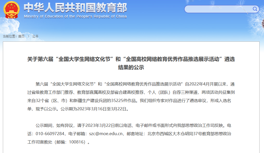 據悉,作為全國高校網絡思政領域最高級別競賽之一,第六屆“全國大學生網絡文化節(jié)”和“全國高校網絡教育優(yōu)秀作品推選展示活動” 兩項活動共征集到來自32個?。▍^(qū)、市)和新疆生產建設兵團的35225件作品。網絡文化節(jié)征集作品類型包括微視頻、微電影、動漫、攝影、網文、公益廣告、音頻、校園歌曲、其他類網絡創(chuàng)新作品等9類。網絡教育優(yōu)秀作品包括優(yōu)秀網絡文章、優(yōu)秀工作案例、優(yōu)秀微課、優(yōu)秀新媒體作品等4類。此次,我校共推薦九類134個作品參賽。