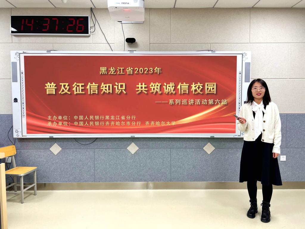 為進一步提升我校師生征信與信用意識,強化守信觀和價值觀教育,在中國人民銀行黑龍江省分行的指導下,11月10日,我校與中國人民銀行齊齊哈爾市分行共同承辦的2023年黑龍江省“普及征信知識 共筑誠信校園”系列巡講第六站活動在養(yǎng)正樓408智慧教室舉行。