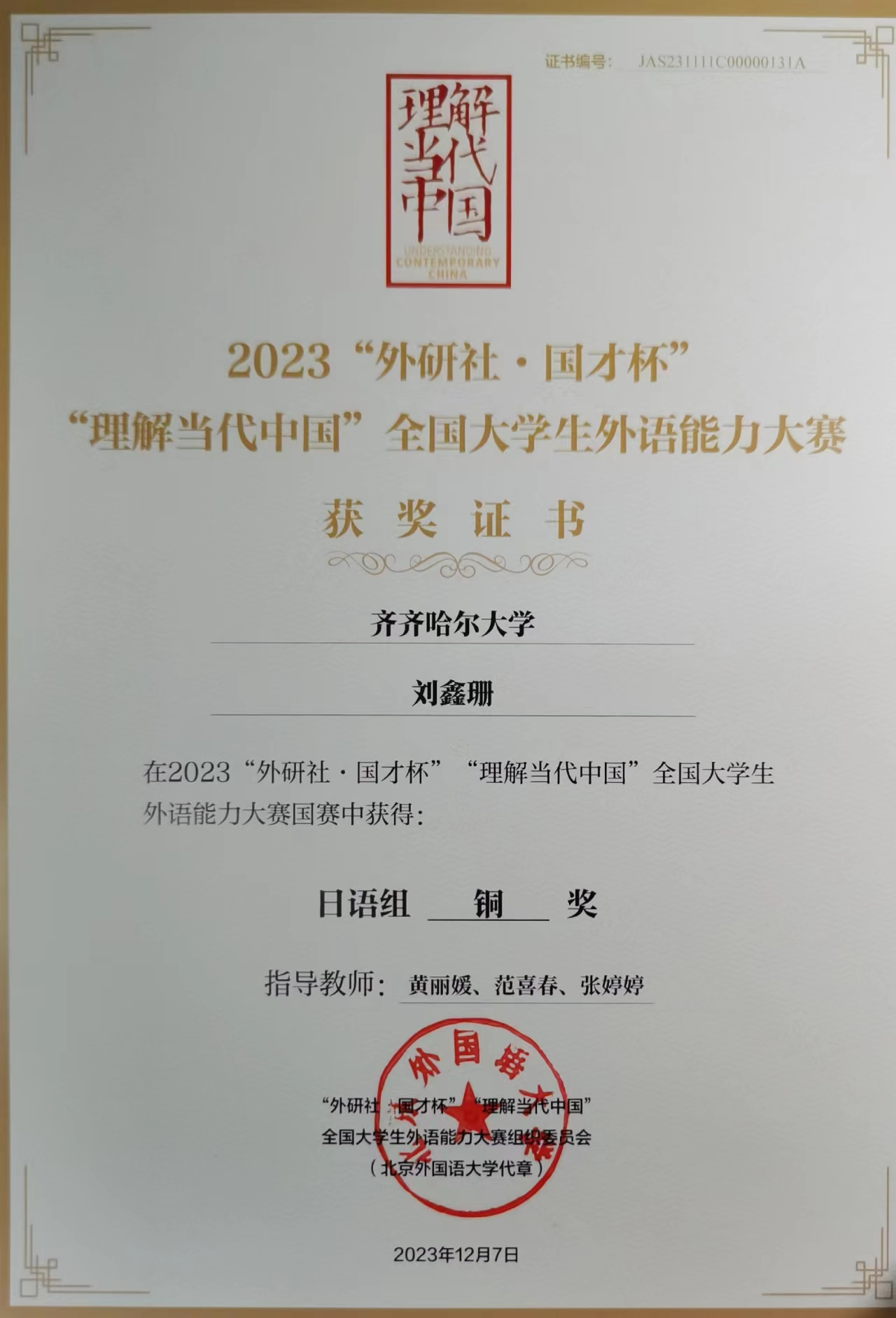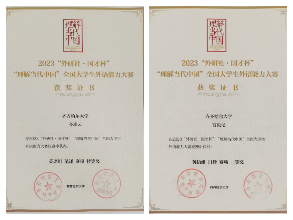 近期,我校學生參加了2023“外研社·國才杯”“理解當代中國”全國大學生外語能力大賽。經(jīng)過各輪賽事的激烈角逐,日語專業(yè)劉鑫珊斬獲國賽銅獎,英語專業(yè)宮毅記、齊凌云,俄語專業(yè)劉麗艷、德語專業(yè)楊思琪斬獲省賽銀獎,俄語專業(yè)張瑞雪、德語專業(yè)于彤彤斬獲省賽銅獎。