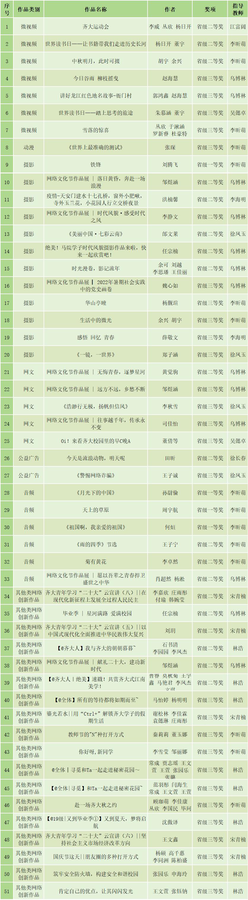 我校52項(xiàng)作品在第七屆“全省大學(xué)生網(wǎng)絡(luò)文化節(jié)”獲獎(jiǎng),分別是一等獎(jiǎng)4項(xiàng),二等獎(jiǎng)20項(xiàng),三等獎(jiǎng)27項(xiàng)。其中,環(huán)藝201劉騰飛同學(xué)的《鐵鋒》獲全省攝影類作品一等獎(jiǎng),朝鮮語231班孫尉倫同學(xué)的《月光下的中國》、播主222班周宇航同學(xué)的《天上的草原》、音樂表演232班何烜同學(xué)的《祖國啊,我親愛的祖國》分別獲得全省音頻類作品一等獎(jiǎng);由烏博林、李昕萌老師提交的作品《詩詞“邂逅”大美校園,沉浸時(shí)令節(jié)氣之美》獲得“全省高校網(wǎng)絡(luò)教育優(yōu)秀作品推選展示活動(dòng)”優(yōu)秀工作案例二等獎(jiǎng)。本次獲獎(jiǎng)作品數(shù)量和質(zhì)量均有新的突破,充分展現(xiàn)我校在繁榮網(wǎng)絡(luò)文化、推進(jìn)高校網(wǎng)絡(luò)思政育人工作上取得的成效。