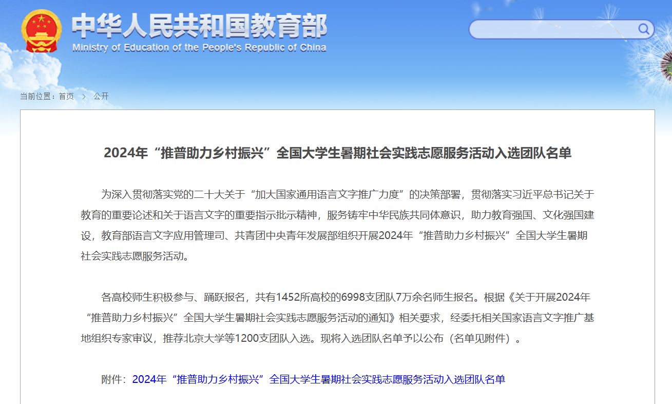 2024年“推普助力鄉(xiāng)村振興”全國(guó)大學(xué)生暑期社會(huì)實(shí)踐志愿服務(wù)活動(dòng)的開展旨在深入學(xué)習(xí)習(xí)近平總書記關(guān)于教育的重要論述和關(guān)于語(yǔ)言文字的重要指示批示精神,貫徹落實(shí)黨的二十大關(guān)于“加大國(guó)家通用語(yǔ)言文字推廣力度”的決策部署,服務(wù)鑄牢中華民族共同體意識(shí),助力教育強(qiáng)國(guó)、文化強(qiáng)國(guó)建設(shè)。我校入選的兩支團(tuán)隊(duì)將按照學(xué)校黨委關(guān)于深化大學(xué)生思想政治工作的總體部署和校團(tuán)委相關(guān)安排,利用暑假時(shí)間,深入語(yǔ)言文字工作基礎(chǔ)較薄弱的民族地區(qū)、農(nóng)村地區(qū),聚焦160個(gè)國(guó)家鄉(xiāng)村振興重點(diǎn)幫扶縣的街道社區(qū)、農(nóng)村基層、中小學(xué)校、青少年之家,聚焦學(xué)前兒童青少年學(xué)生、青壯年勞動(dòng)力、基層干部、留守婦女和老人等開展推普助力鄉(xiāng)村振興相關(guān)志愿服務(wù)活動(dòng)。
