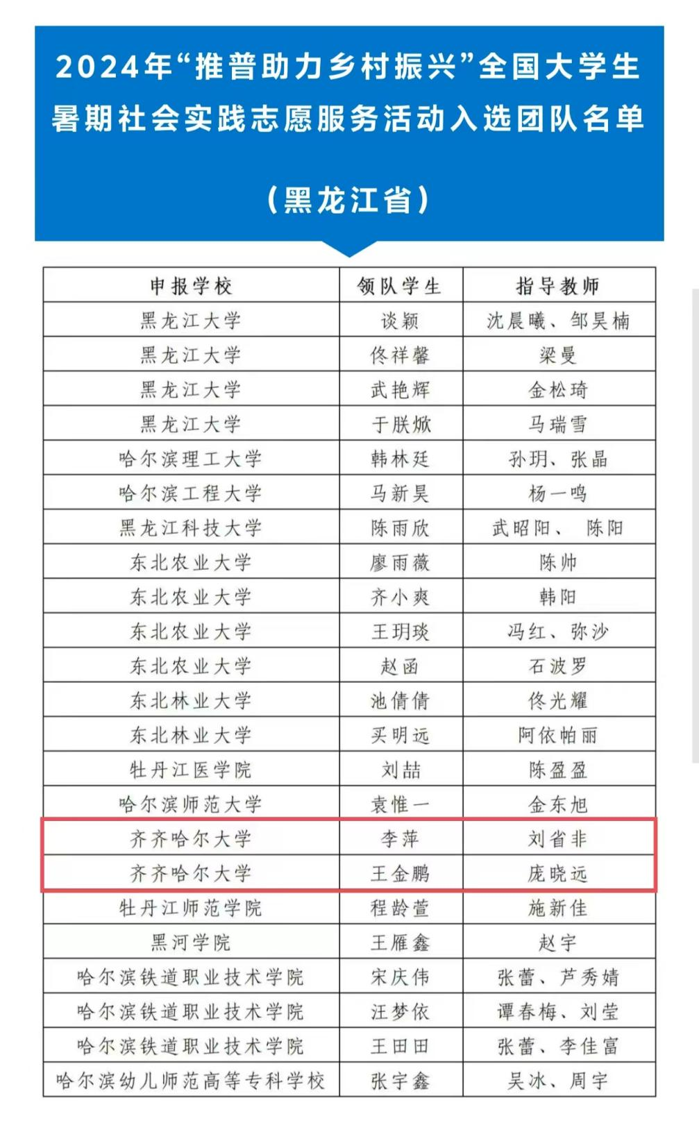 近日,教育部網(wǎng)站公布2024年“推普助力鄉(xiāng)村振興”全國(guó)大學(xué)生暑期社會(huì)實(shí)踐志愿服務(wù)活動(dòng)入選團(tuán)隊(duì)名單。經(jīng)委托相關(guān)國(guó)家語(yǔ)言文字推廣基地組織專家審議,推薦1200支團(tuán)隊(duì)入選,黑龍江23支團(tuán)隊(duì)上榜,其中我校出彩龍江志愿服務(wù)隊(duì)、研究生志愿服務(wù)隊(duì)兩支團(tuán)隊(duì)從全國(guó)1452所高校的6998支團(tuán)隊(duì)中脫穎而出,成功入選,評(píng)選結(jié)果被學(xué)習(xí)強(qiáng)國(guó)等平臺(tái)轉(zhuǎn)載。