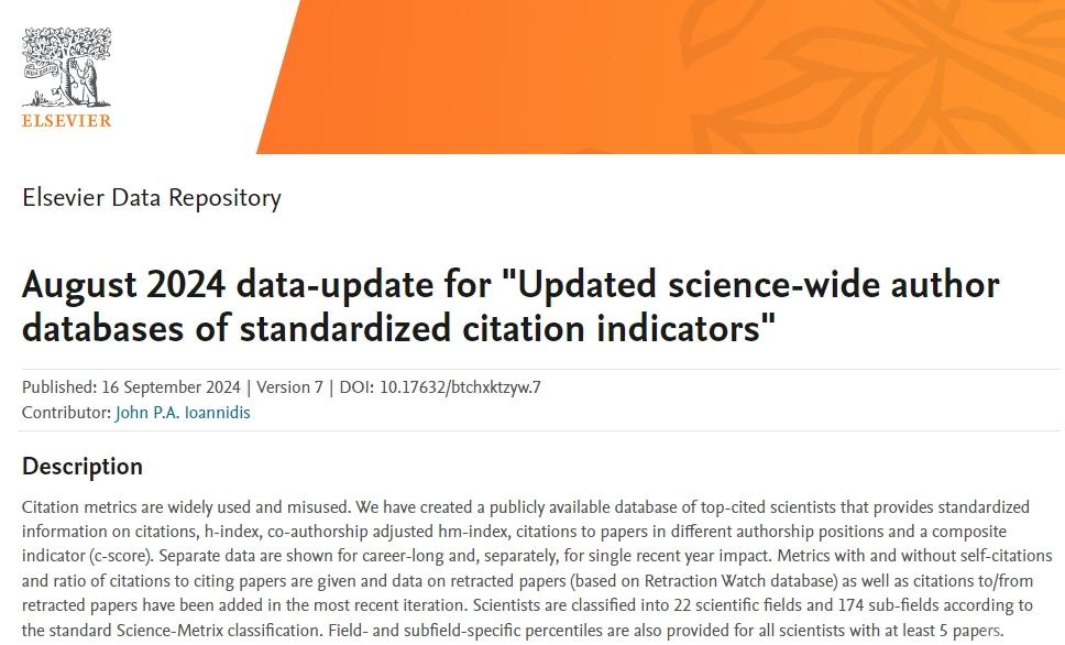 該榜單是斯坦福大學(xué)John P. A. Ioannidis教授團(tuán)隊(duì)與Elsevier的合作成果,榜單基于Scopus數(shù)據(jù)庫(kù)的引用數(shù)據(jù)系統(tǒng)分析,依據(jù)總引用量、Hirsch H-index、共同作者修正Schreiber Hm-index、單獨(dú)作者、單獨(dú)或者第一作者以及單獨(dú)、第一或者最后作者文章引用量等六種指標(biāo)進(jìn)行綜合評(píng)定,從近700萬(wàn)名科學(xué)家中遴選出世界排名前2%的科學(xué)家,分為22個(gè)領(lǐng)域和174個(gè)細(xì)分子領(lǐng)域。榜單提供了面向科學(xué)家長(zhǎng)期科研表現(xiàn)的衡量指標(biāo),客觀真實(shí)反映科學(xué)家的學(xué)術(shù)影響力。