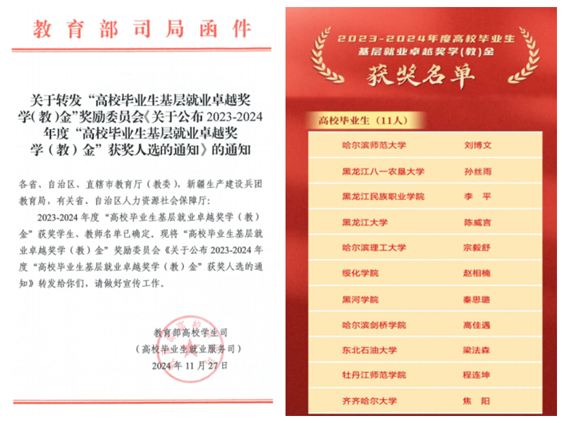 近日,教育部公布2023—2024年度“高校畢業(yè)生基層就業(yè)卓越獎(jiǎng)學(xué)(教)金”獲獎(jiǎng)人選名單,黑龍江省11名學(xué)生上榜,我校畢業(yè)生焦陽(yáng)同學(xué)位列其中。