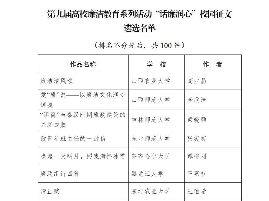 近日,教育部公布《關(guān)于第九屆高校廉潔教育系列活動(dòng)結(jié)果的公示》,我校馬克思主義學(xué)院譚柳劉同學(xué)的作品成功入選“話廉潤(rùn)心”校園征文教育部遴選名單。這是繼2023年我校馬克思主義學(xué)院徐光迪同學(xué)的作品《大雨》獲教育部第八屆高校廉潔教育系列活動(dòng)“廉心文語(yǔ)”校園征文優(yōu)秀作品獎(jiǎng)之后的又一榮譽(yù)。