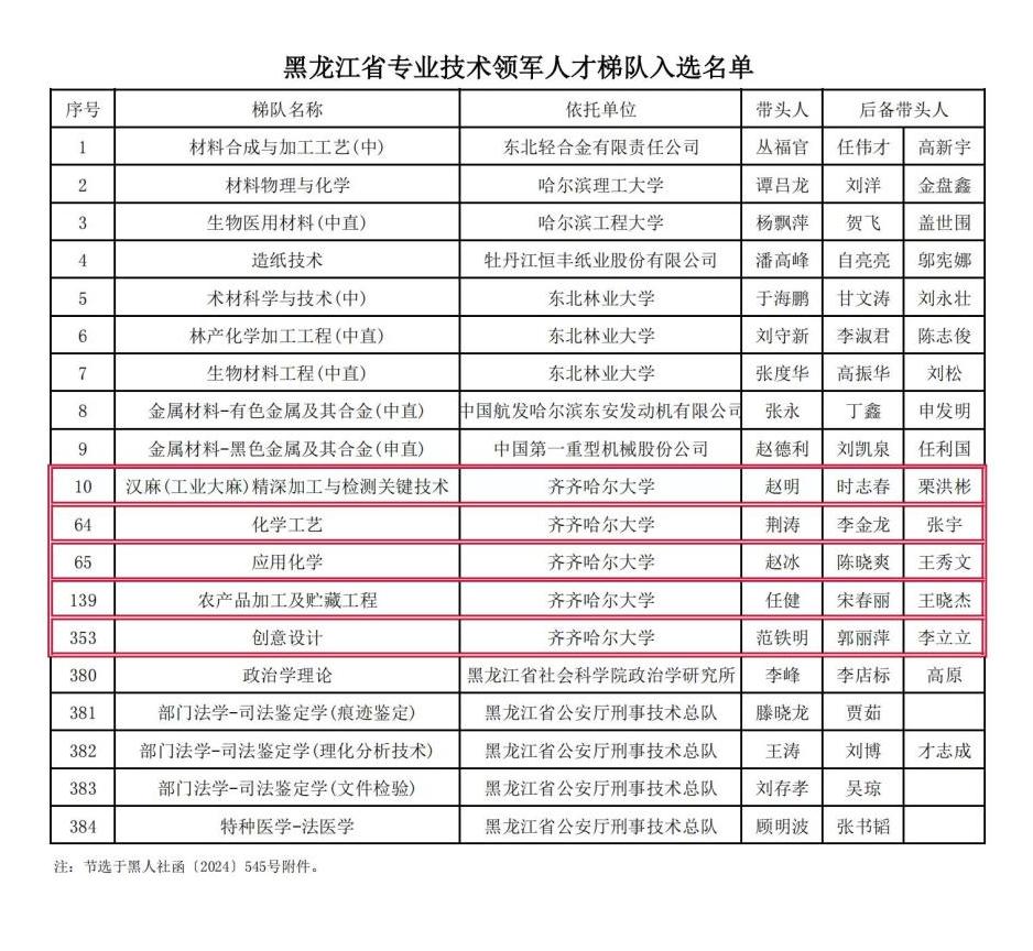 近日,黑龍江省人力資源和社會保障廳公布了2024年度黑龍江省專業(yè)技術(shù)領(lǐng)軍人才梯隊入選名單,我校組織申報的漢麻(工業(yè)大麻)精深加工與檢測關(guān)鍵技術(shù)、化學(xué)工藝、應(yīng)用化學(xué)、農(nóng)產(chǎn)品加工及貯藏工程、創(chuàng)意設(shè)計等5個梯隊通過省人社廳的資格審查、專家評審、網(wǎng)上公示,獲批為黑龍江省專業(yè)技術(shù)領(lǐng)軍人才梯隊,標志著我校在高層次人才培養(yǎng)方面取得了新的重大突破。