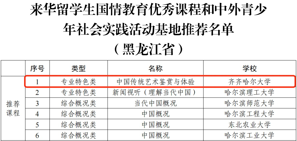 近日,中國(guó)教育國(guó)際交流協(xié)會(huì)公布首批“來(lái)華留學(xué)生國(guó)情教育優(yōu)秀課程和中外青少年社會(huì)實(shí)踐活動(dòng)基地”推薦名單,我?!吨袊?guó)傳統(tǒng)藝術(shù)鑒賞與體驗(yàn)》獲批專(zhuān)業(yè)特色類(lèi)優(yōu)秀課程,成為全國(guó)首批來(lái)華留學(xué)生國(guó)情教育優(yōu)秀課程之一。