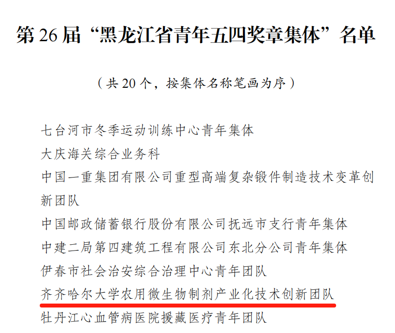 近日,團(tuán)省委、省青聯(lián)聯(lián)合發(fā)布了《關(guān)于頒授第26屆黑龍江省青年五四獎?wù)碌臎Q定》,我校農(nóng)用微生物制劑產(chǎn)業(yè)化技術(shù)創(chuàng)新團(tuán)隊榮獲第26屆“黑龍江省青年五四獎?wù)录w”榮譽(yù)稱號。