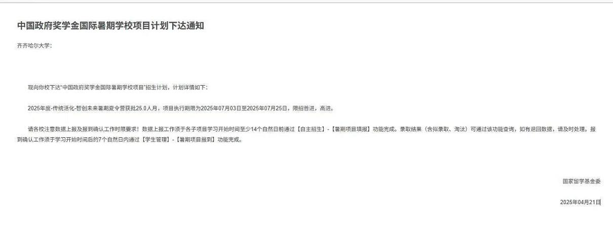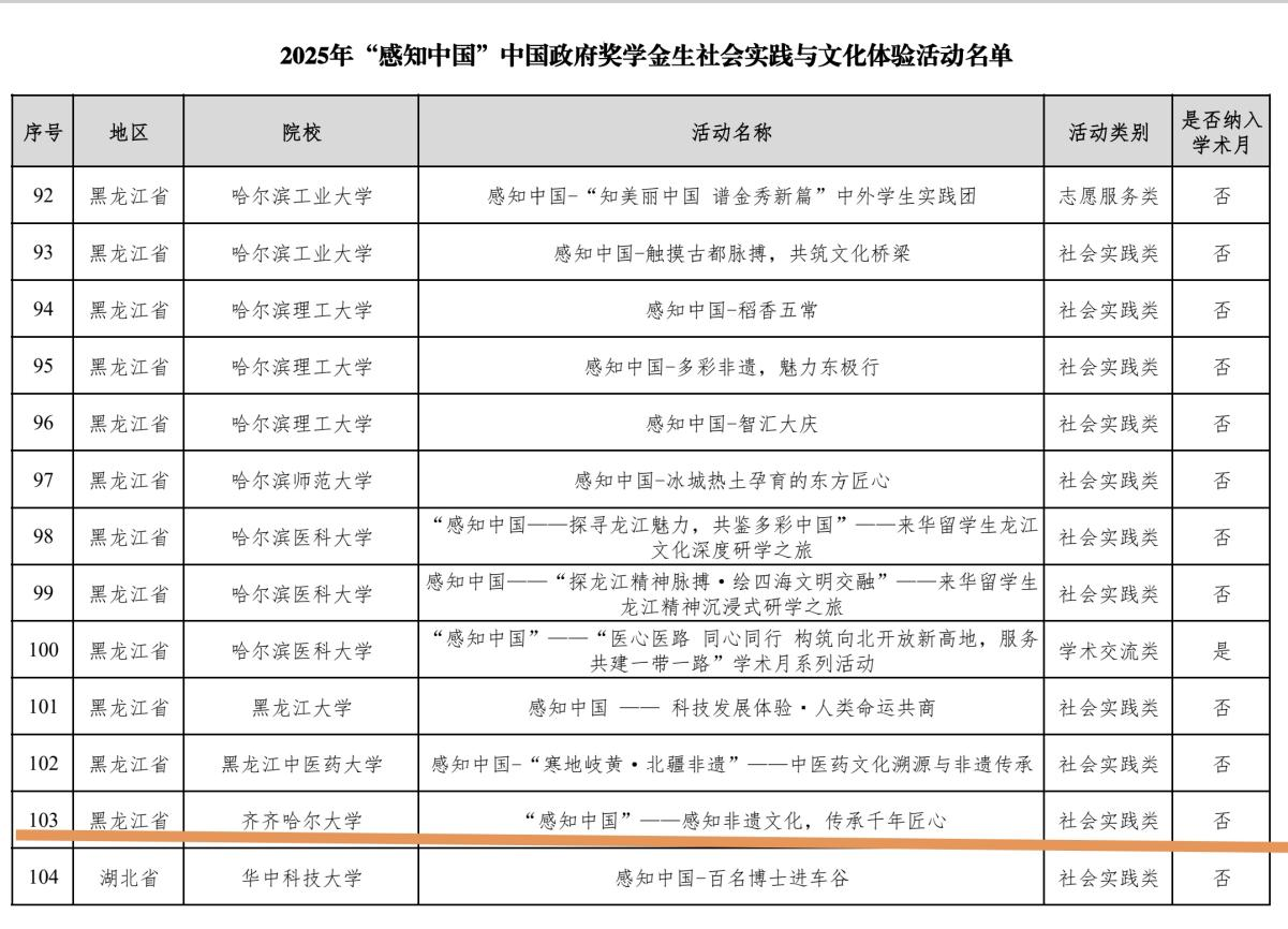 近日,國家留學(xué)基金管理委員會下發(fā)了《中國政府獎學(xué)金國際暑期學(xué)校項(xiàng)目計(jì)劃下達(dá)通知》及《2025年“感知中國”活動方案批復(fù)》,我校申報的《齊齊哈爾大學(xué)-傳統(tǒng)活化·智創(chuàng)未來暑期夏令營》《“感知中國”——感知非遺文化,傳承千年匠心》2個項(xiàng)目通過評審。