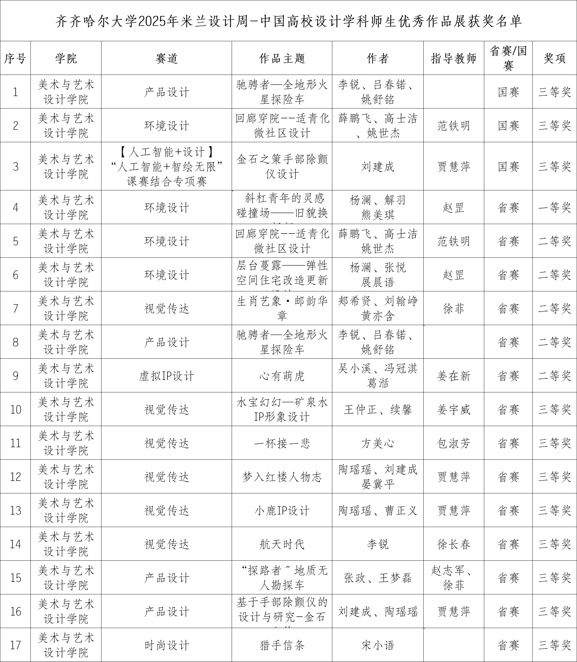 本次大賽取得的成績彰顯了我?!敖藤惾诤?、產(chǎn)教協(xié)同”的辦學(xué)特色,是對設(shè)計學(xué)科教學(xué)質(zhì)量與人才培養(yǎng)成效的充分肯定,也是學(xué)校深化教學(xué)改革、優(yōu)化學(xué)科建設(shè)、精準對接我省“4567”現(xiàn)代產(chǎn)業(yè)體系中創(chuàng)意設(shè)計產(chǎn)業(yè)人才需求的成果體現(xiàn)。未來,學(xué)校將持續(xù)優(yōu)化創(chuàng)新型設(shè)計人才培養(yǎng)體系,為龍江振興提供堅實人才支撐。