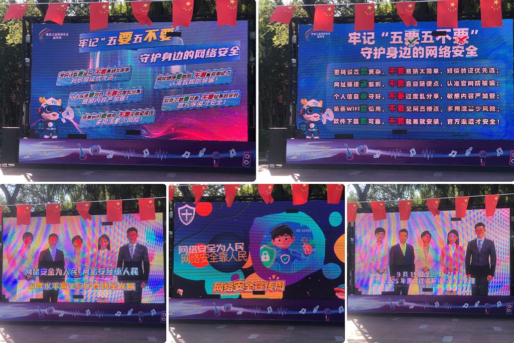 學(xué)校在守正樓陽光大廳設(shè)置了16塊大型宣傳展板,內(nèi)容涵蓋政策法規(guī)、數(shù)據(jù)安全、個(gè)人信息保護(hù);校內(nèi)網(wǎng)首頁設(shè)“2025年國家網(wǎng)絡(luò)安全周”主題圖片及官方鏈接;在各校區(qū)張貼海報(bào)、懸掛橫幅,LED屏循環(huán)播放主題標(biāo)語以及《牢記“五要五不要”守護(hù)身邊的網(wǎng)絡(luò)安全》視頻;官方微信公眾號及各學(xué)院平臺發(fā)布防護(hù)指南,推廣“AI護(hù)校園”安全防護(hù)智能體,助力師生快速識別風(fēng)險(xiǎn);還通過新生入學(xué)教育、主題班會,結(jié)合高校網(wǎng)絡(luò)素養(yǎng)學(xué)習(xí)資源庫,開展網(wǎng)絡(luò)認(rèn)知、反間防諜等宣講。