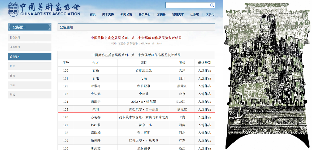 全國版畫作品展覽由中國美術(shù)家協(xié)會主辦,每兩年舉辦一次,是國內(nèi)版畫藝術(shù)領(lǐng)域最具權(quán)威性和影響力的版畫展覽。本屆展覽堅(jiān)持“學(xué)術(shù)性、思想性與藝術(shù)性并重”的評審原則,最終遴選出228件精品力作。我省共有17件作品入選,宋陽老師的作品位列其中,這也是宋陽繼2024年入選第十四屆全國美術(shù)作品展覽之后獲得的又一重要獎(jiǎng)項(xiàng)。