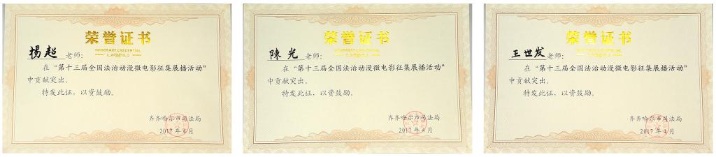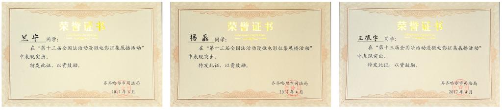 4月11日,因在“第十三屆全國(guó)法治動(dòng)漫微電影征集展播活動(dòng)”中表現(xiàn)突出,我校蘭寧、楊磊、王振宇等17名同學(xué),楊超、陳光、王世發(fā)3位指導(dǎo)教師獲齊齊哈爾市司法局表彰。