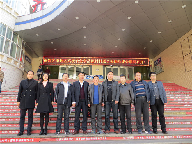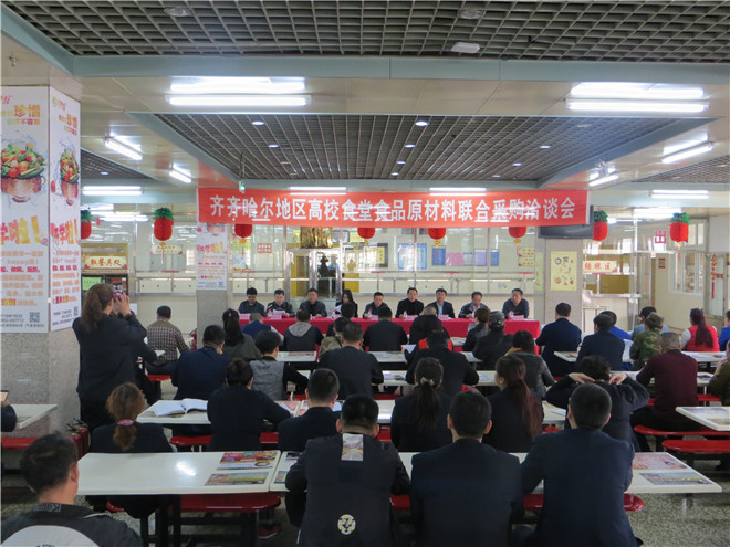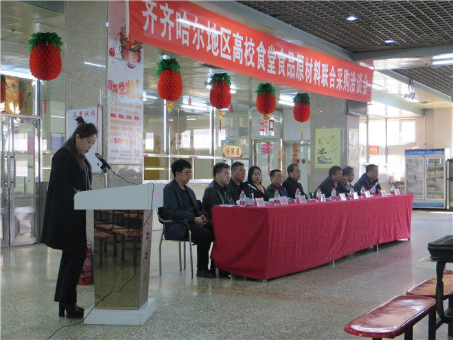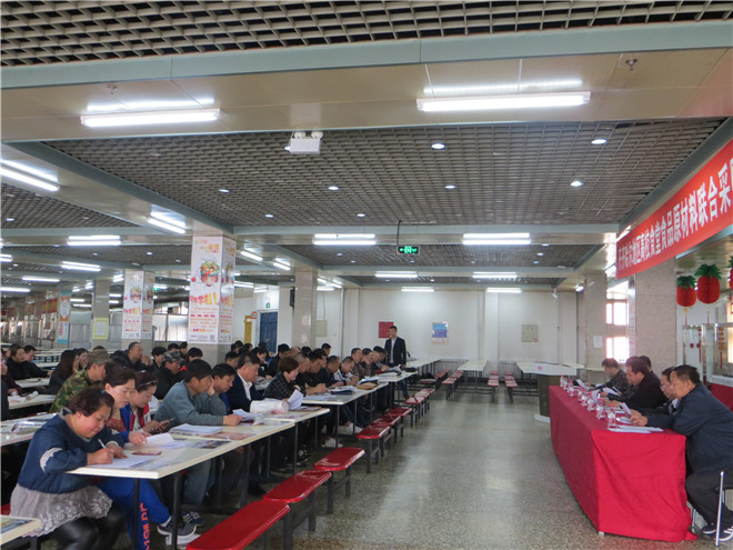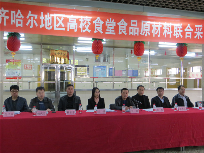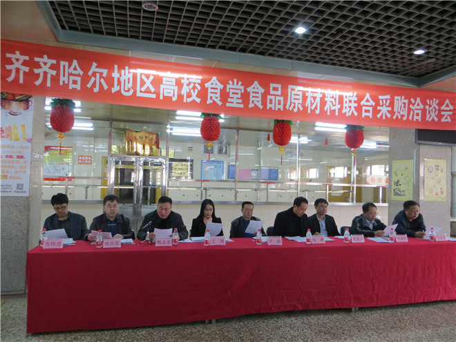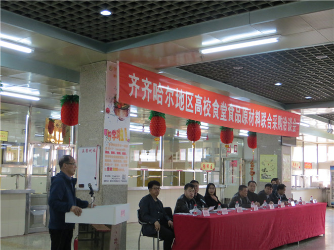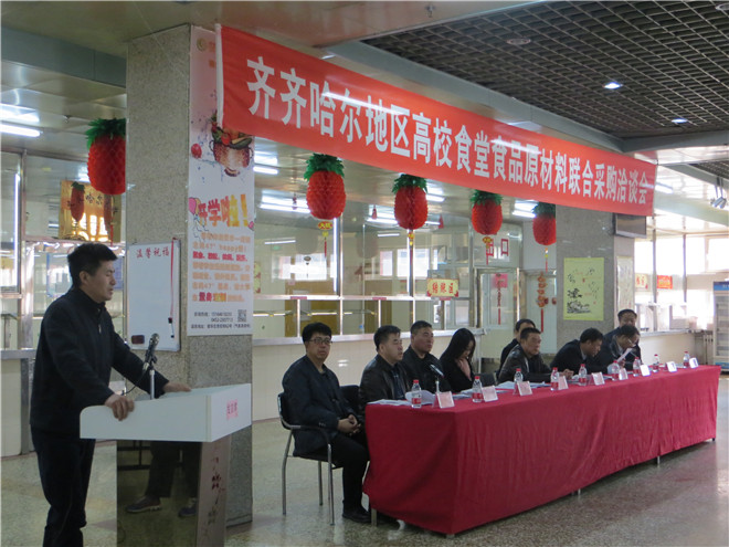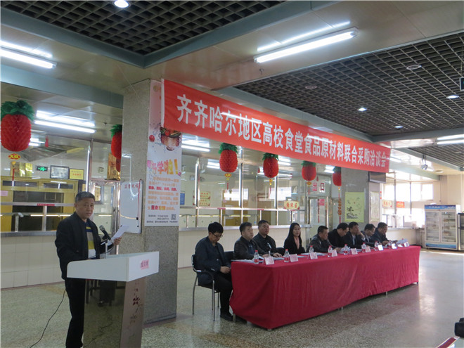 為大力推進高校食堂伙食物資準(zhǔn)入制工作,完善可追溯源頭的食品安全監(jiān)管體系,有效降低食堂食品原材料采購成本,2017年4月15日上午9:00時,齊齊哈爾地區(qū)4所高校在我校學(xué)生食堂大廳召開了食品原材料聯(lián)合采購洽談會議。齊齊哈爾大學(xué)后勤管理處處長尹鷗、審計處處長王鴻、財務(wù)處副處長寧國祥,齊齊哈爾醫(yī)學(xué)院后勤管理處處長徐輝、財務(wù)處處長黃秀義、后勤管理處副處長倪偉芳,黑龍江交通職業(yè)技術(shù)學(xué)院后勤處副處長孫文杰,齊齊哈爾高等師范??茖W(xué)校餐飲中心主任楊志東等領(lǐng)導(dǎo)出席了會議。會議由齊齊哈爾大學(xué)后勤管理處副處長、省伙專會常委會副主任楊慶忠主持,聯(lián)合采購工作組人員以及45家企業(yè)和供應(yīng)商參加了會議。