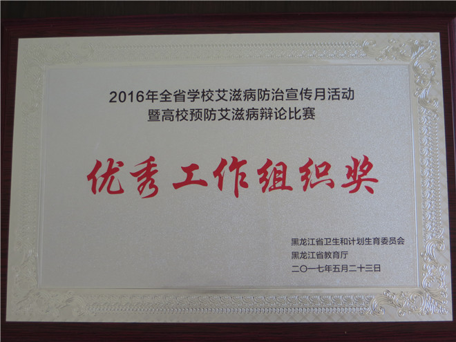 2017年5月23日,在黑龍江省衛(wèi)生和計(jì)劃生育委員會(huì)與省教育廳聯(lián)合舉辦的2016年高校預(yù)防艾滋病辯論賽總結(jié)和表彰會(huì)上,我校榮獲2016年全省學(xué)校艾滋病防治宣傳月活動(dòng)暨高校預(yù)防艾滋病辯論比賽優(yōu)秀工作組織獎(jiǎng)。