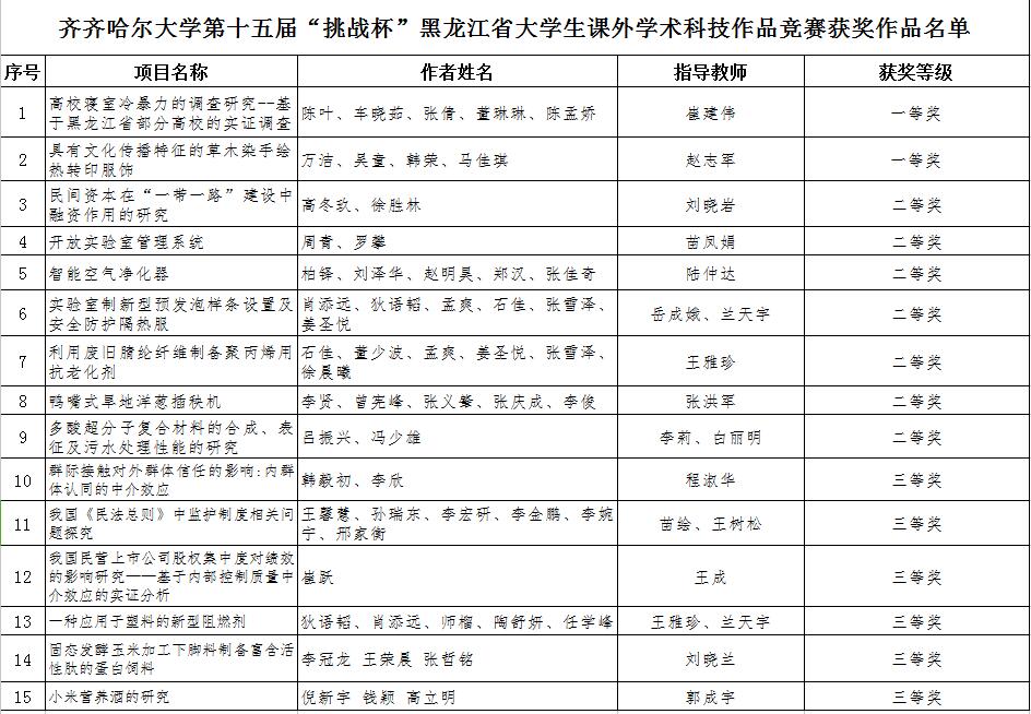 近日,由團(tuán)省委、省教育廳、省科技廳、省社科院、省學(xué)聯(lián)聯(lián)合主辦的第十五屆“挑戰(zhàn)杯”黑龍江省大學(xué)生課外學(xué)術(shù)科技作品競賽決賽評審工作圓滿結(jié)束,我校有15項作品獲獎,學(xué)校獲得優(yōu)秀組織獎。