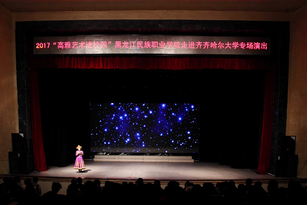 11月2日18:30,2017“高雅藝術進校園”——黑龍江民族職業(yè)學院走進齊齊哈爾大學專場演出在我校文化宮舉辦。黑龍江民族職業(yè)學院藝術與傳媒系副主任何苗帶領70余名師生,為我校師生送來了一場極富東北地方民族特色的藝術盛宴。學生工作部(學生處)部(處)長姜波,音樂與舞蹈學院院長孫相根,校黨委宣傳統(tǒng)戰(zhàn)部副部長孟憲國、何強,音樂與舞蹈學院副院長包明德與我校1300余名師生共同觀賞了演出。
